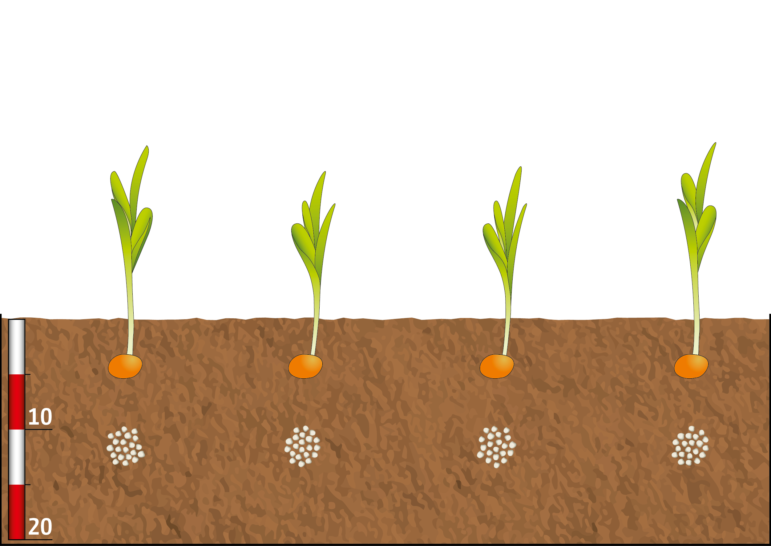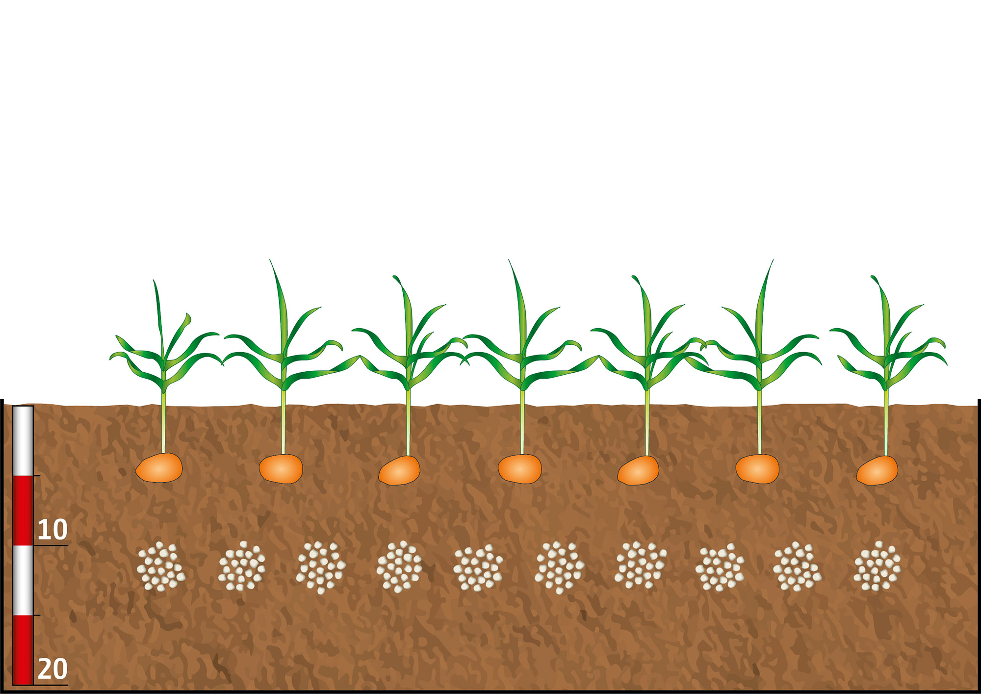 A FertiSpot alkalmazása: kukoricában közvetlenül a mag alá, cukorrépában a növénysorok közé