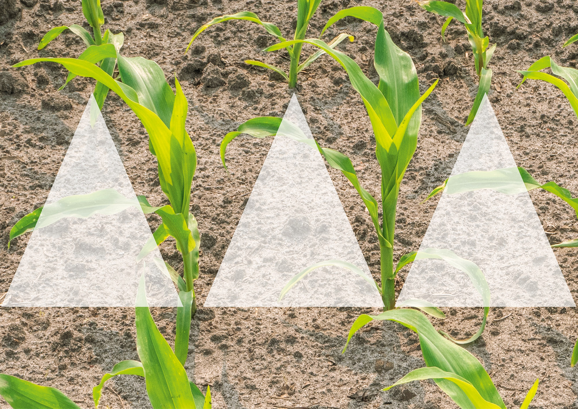 Kukoricaültetés háromszög-elrendezéssel – az egyes növények a szomszédos sorhoz képest eltolva helyezkednek el