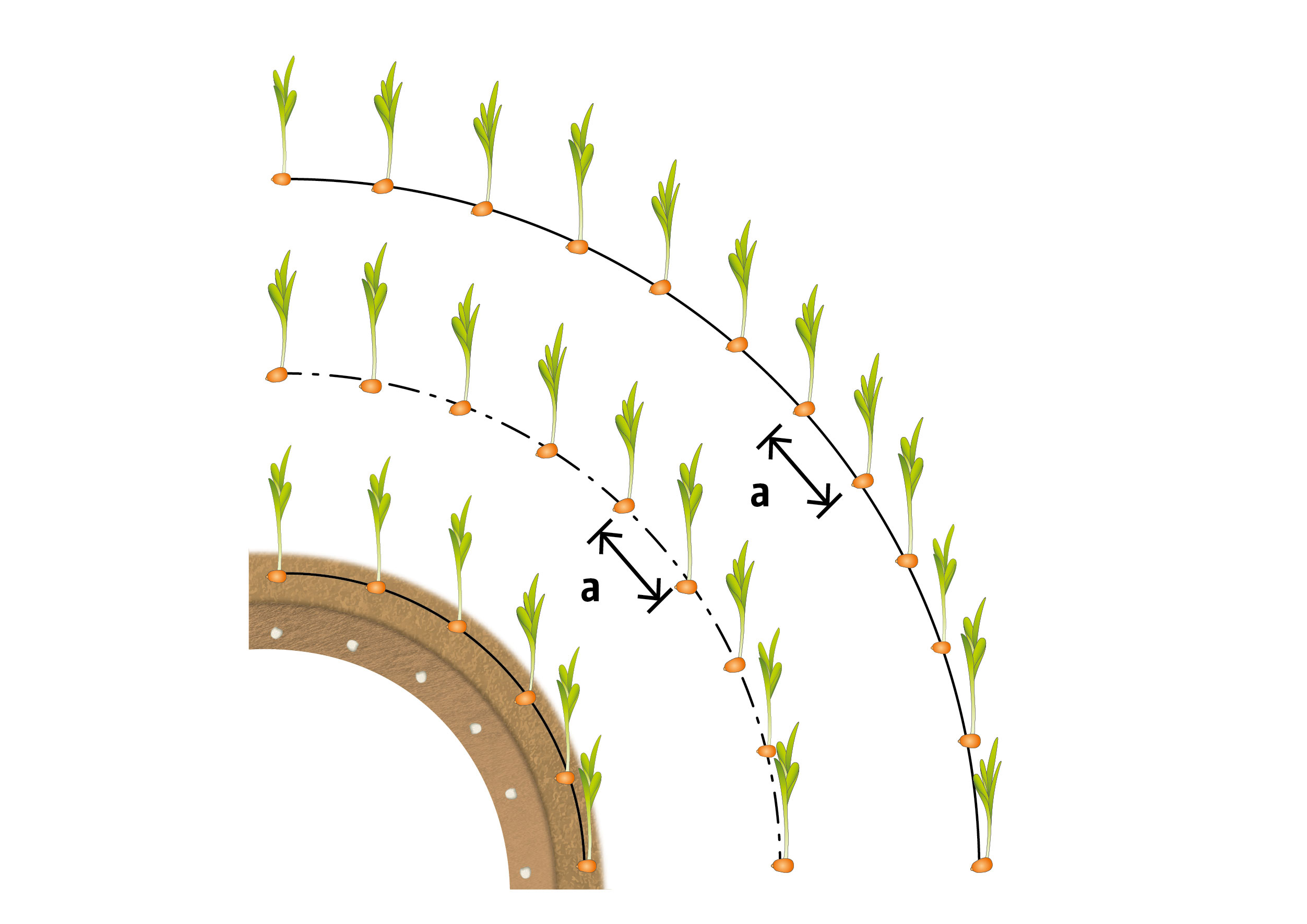 A vetőegységek sorok közötti szinkronizálásával a vetőmag és a műtrágya háromszög-elrendezésben vagy blokkos elrendezésben helyezhető el. Ezzel maximalizálható a növények közötti távolság és optimalizálható a térbeli eloszlás. Minden növény számára javul a tápanyagok, a fény, a víz és a levegő elérhetősége.