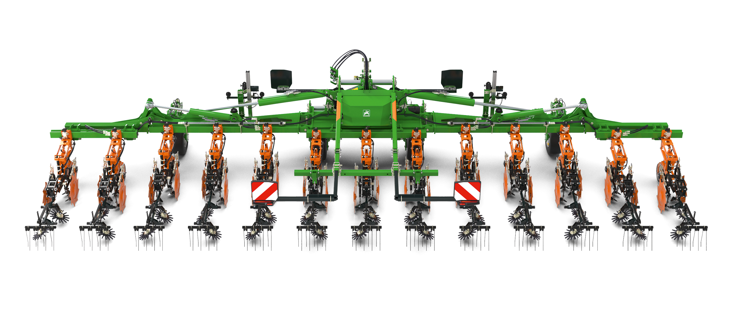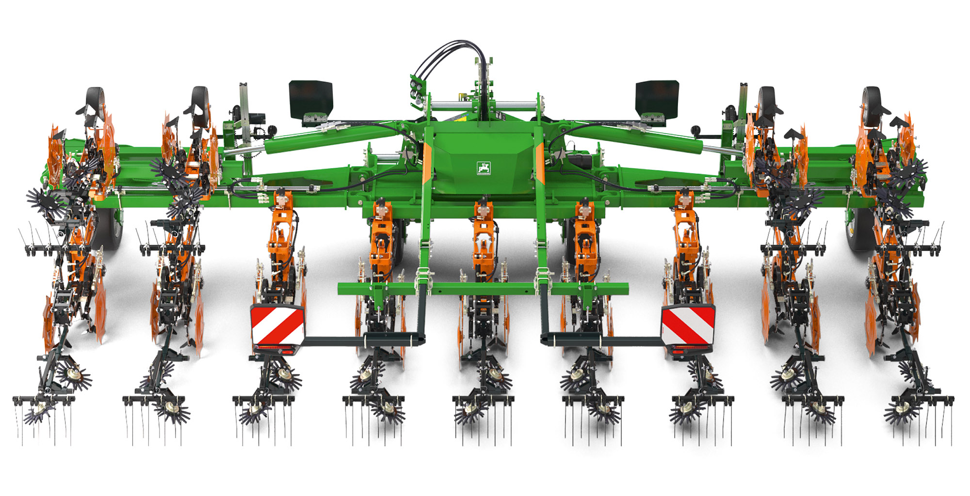 A Venterra VR 4 gépet moduláris rendszerként fejlesztettük a maximális rugalmasság érdekében. Ez azt jelenti, hogy a gépet később is könnyen hozzá lehet igazítani a megváltozott üzemeltetési helyzetekhez, például a külső tagok összecsukásával, amivel a munkaszélesség 9 méterről 6 méterre csökkenthető. Az opcionális szerszámok, mint például a kapavédő lemezek, a gyomvágók, a magtakaró pálcák vagy az ujjas kapák utólag is bármikor felszerelhetők, emellett külön vezetetett paralelogramma-szerkezeten helyezkednek el, így minden helyzetben képesek pontosan követni a talajt.