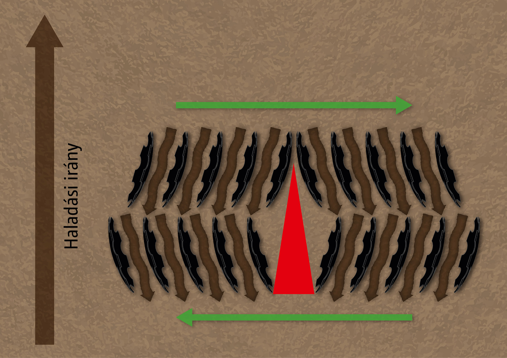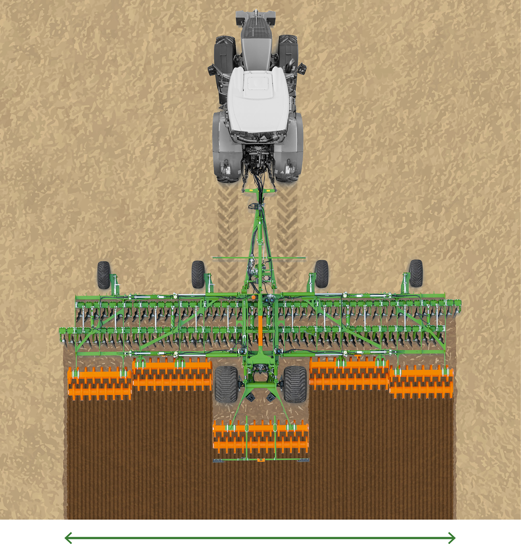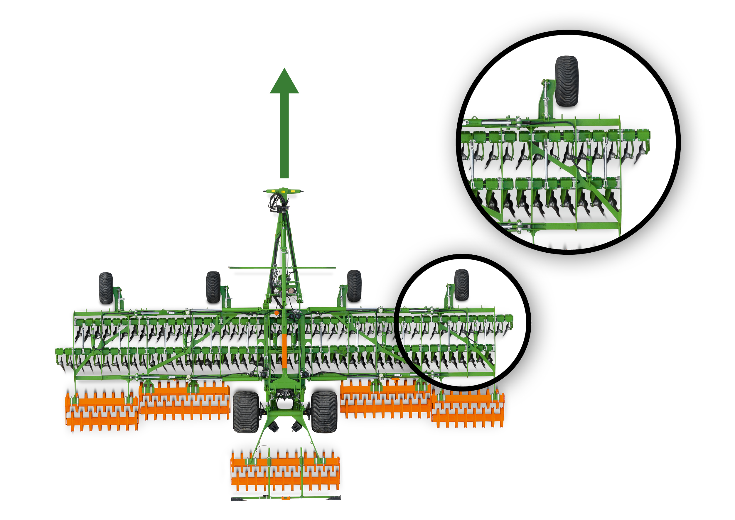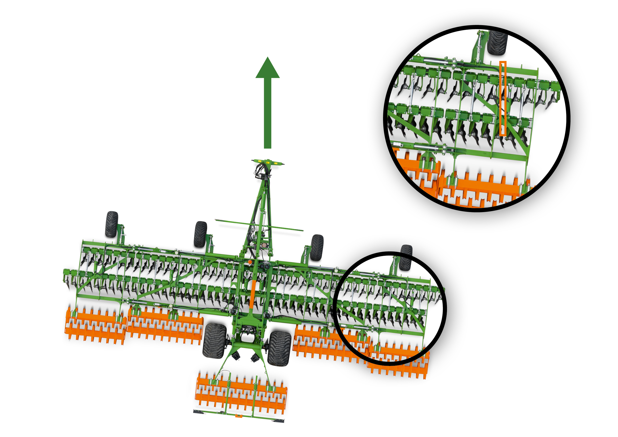 V-elrendezés esetén - mint minden AMAZONE rövidtárcsánál - az első és a második tárcsasor tárcsái egymással szemben vannak elhelyezve. A tárcsák soronként egyenletes elrendezése fix tárcsatávolságot biztosít a teljes munkaszélességben. Ez a megoldás - az X-elrendezéssel szemben - a teljes munkaszélességben állandó művelési minőséget szavatol.