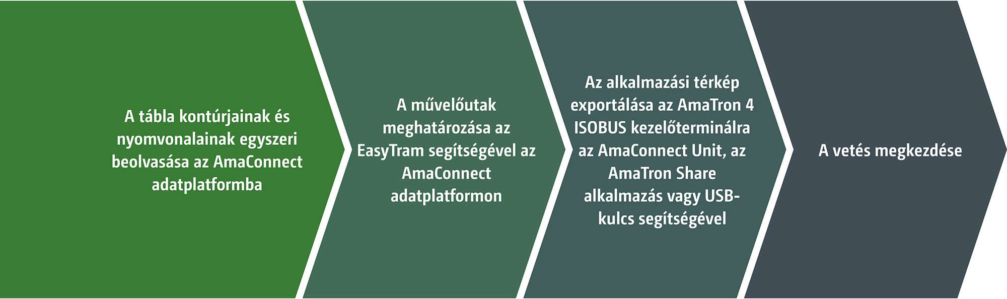 Az EasyTram használata a tábla egyszeri bejárásával kezdődik, amely során rögzítjük a geometriát és az egyedi jellemzőket, például az akadályokat. Ez a bejárás egy normál traktorral is elvégezhető, a mező kontúrjának rögzítése révén. Ha ezek az adatok már rendelkezésre állnak a gazdaságban, akkor azok új bejárás nélkül felhasználhatók. A táblahatárok, adott esetben az A-B vonalak és a kanyarnyomokat ezután az EasyTram tervezőeszközbe importálják az AmaConnect adatplatformon, ahol a művelőutak egyszer kerülnek meghatározásra a vetéshez. A művelőutak meghatározása után a térképet alkalmazási térképként exportálják, és az AmaConnect Unit, az AmaTron Share alkalmazás vagy egy USB-kulcs segítségével átvihető a traktor kezelőtermináljára. Ezután az alkalmazási térképek segítségével a traktoron elindítható a vetés. A MultiSwitch soronkénti kapcsolással ellátott vetőgép ezután a vetés irányától függetlenül kikapcsolja a művelőutakat. Megbízhatóan, évről évre centiméterre pontosan ugyanazon a helyen.
