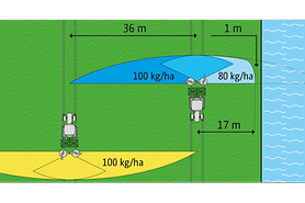 Amennyiben közvetlenül a tábla szélén felszíni víz található, a műtrágyázással kapcsolatos rendelet szerint szóráshatároló berendezés alkalmazása esetén egy méter távolságot, szóráshatároló berendezés alkalmazása nélkül viszont legalább három méter távolságot kell tartani. Annak érdekében, hogy a tábla belső részén a túltrágyázást megelőzze, csökkenteni kell a határoldali szórásmennyiséget.