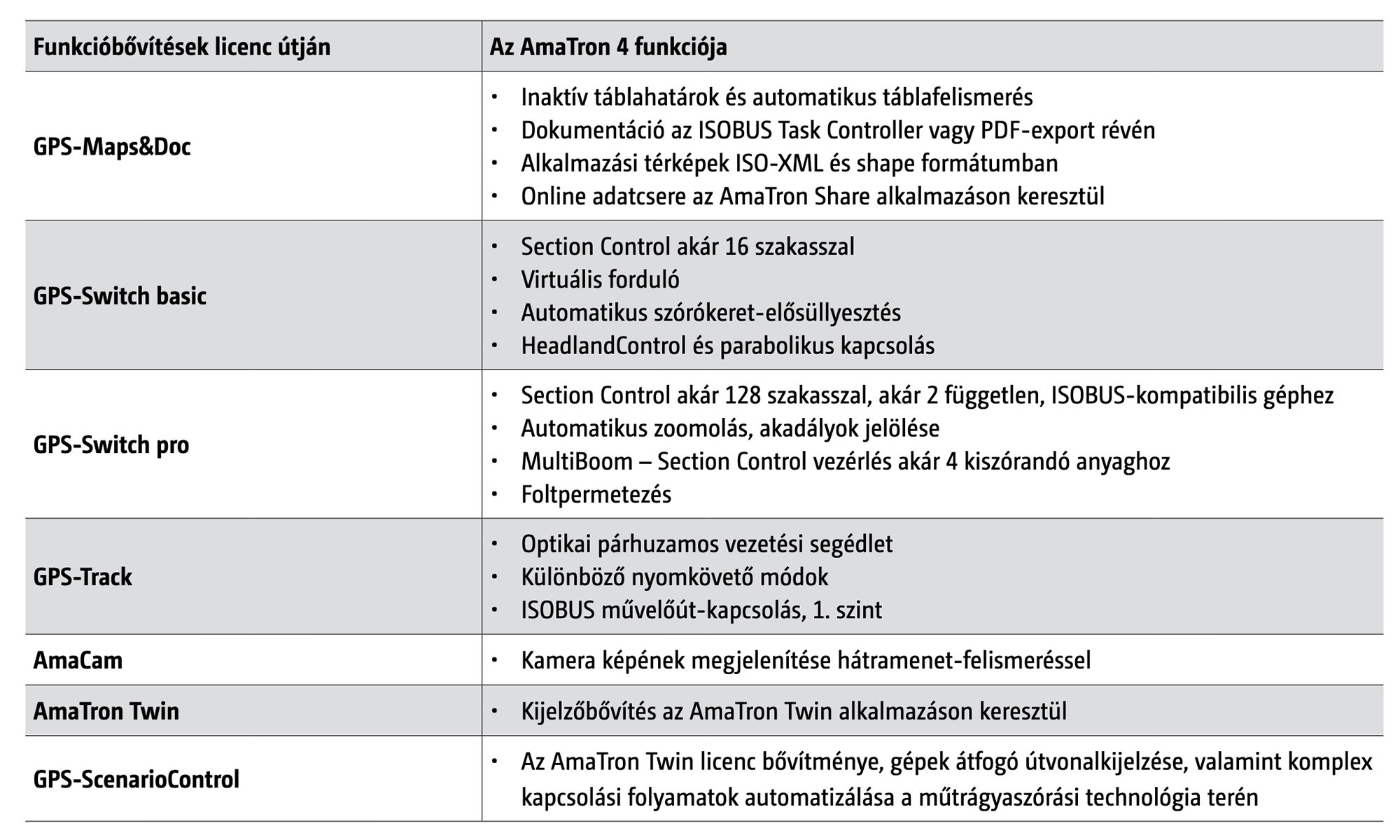 Szoftver mindenkinek – akár tisztán ISOBUS kommunikációs rendszerű gépek kezeléséhez, akár a precíziós gazdálkodási funkciókhoz – az AmaTron 4 különböző opcionális szoftverlicenceket kínál, amelyek minden igényt kielégítenek. Az összes licencet előre telepítjük az AmaTron 4 egységre, és ingyenesen tesztelhetők, vagy a megfelelő jogosultság közvetlenül használni is kezdhető díjfizetés ellenében.