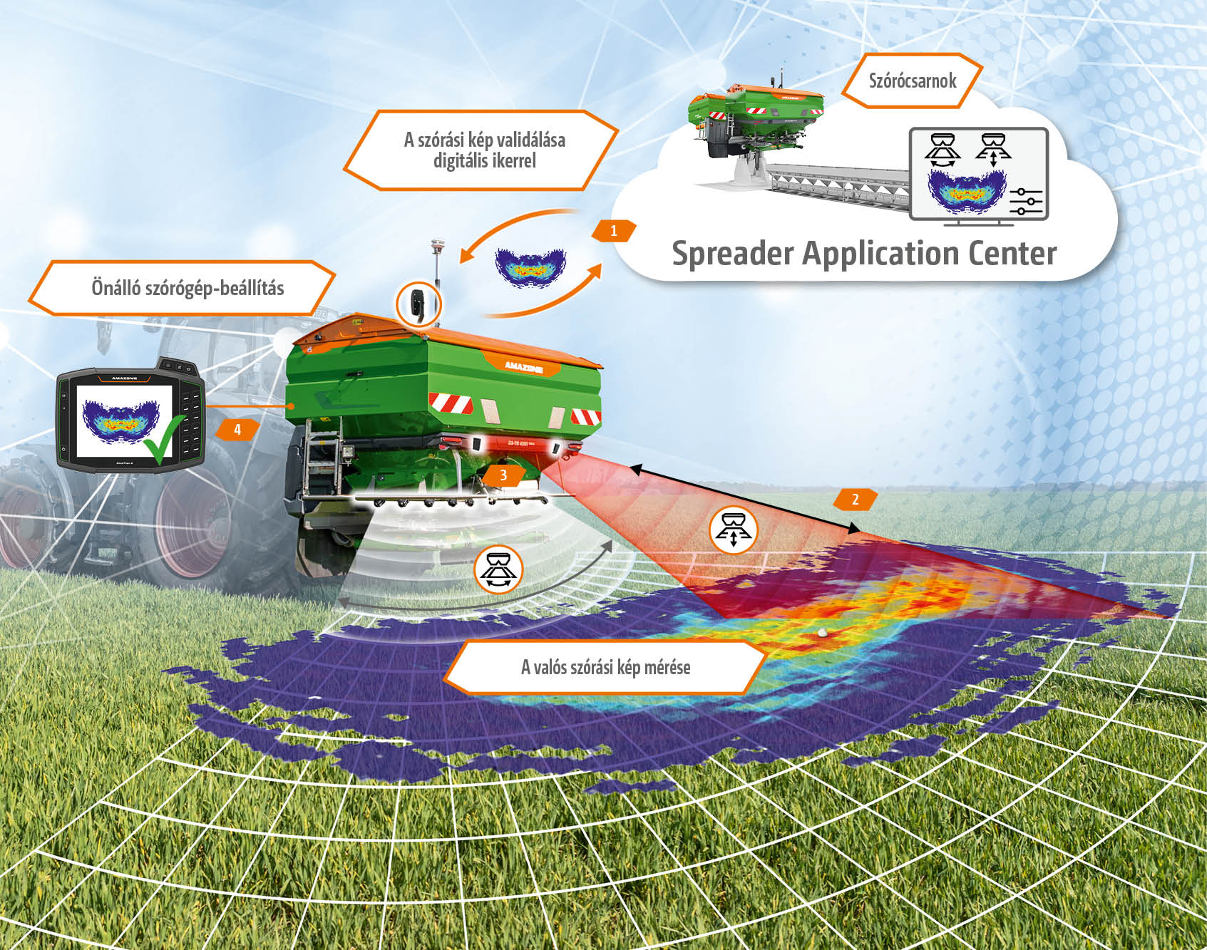 2. A valós szórási kép folyamatos mérése a szórásszélesség és a szórásirány alapján – a szórógép „mobil szórócsarnokként” működik