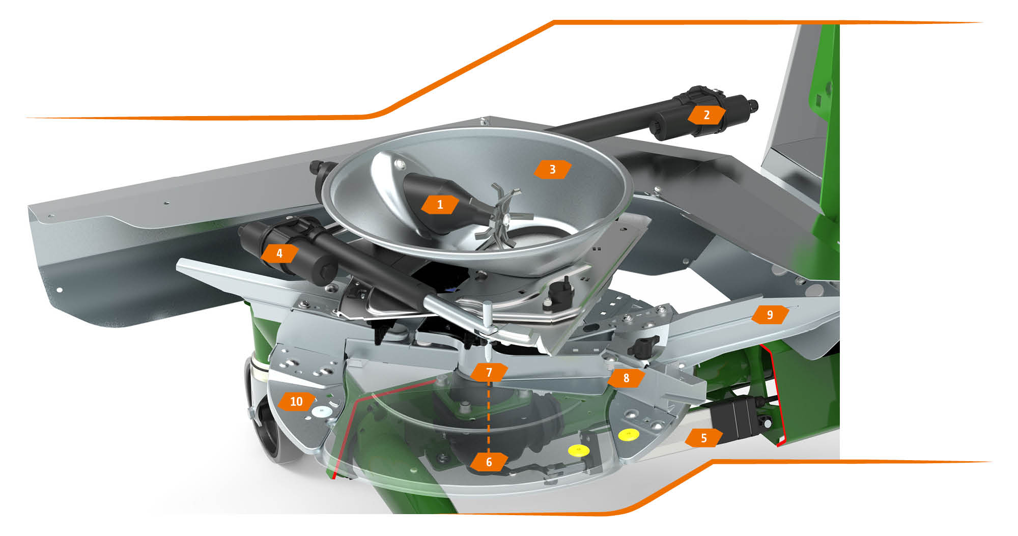 A bevezetőrendszer koncentrikus elfordulása a tárcsa közepe körül lehetővé teszi a különböző munkaszélességekhez és műtrágyatípusokhoz való pontos igazodást, ugyanakkor a szórótárcsa közepéhez közeli feladással kíméli a műtrágyát.