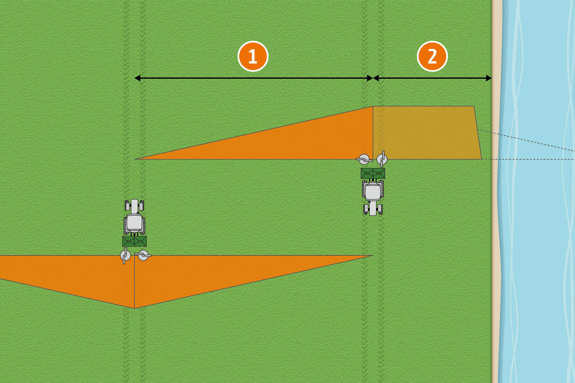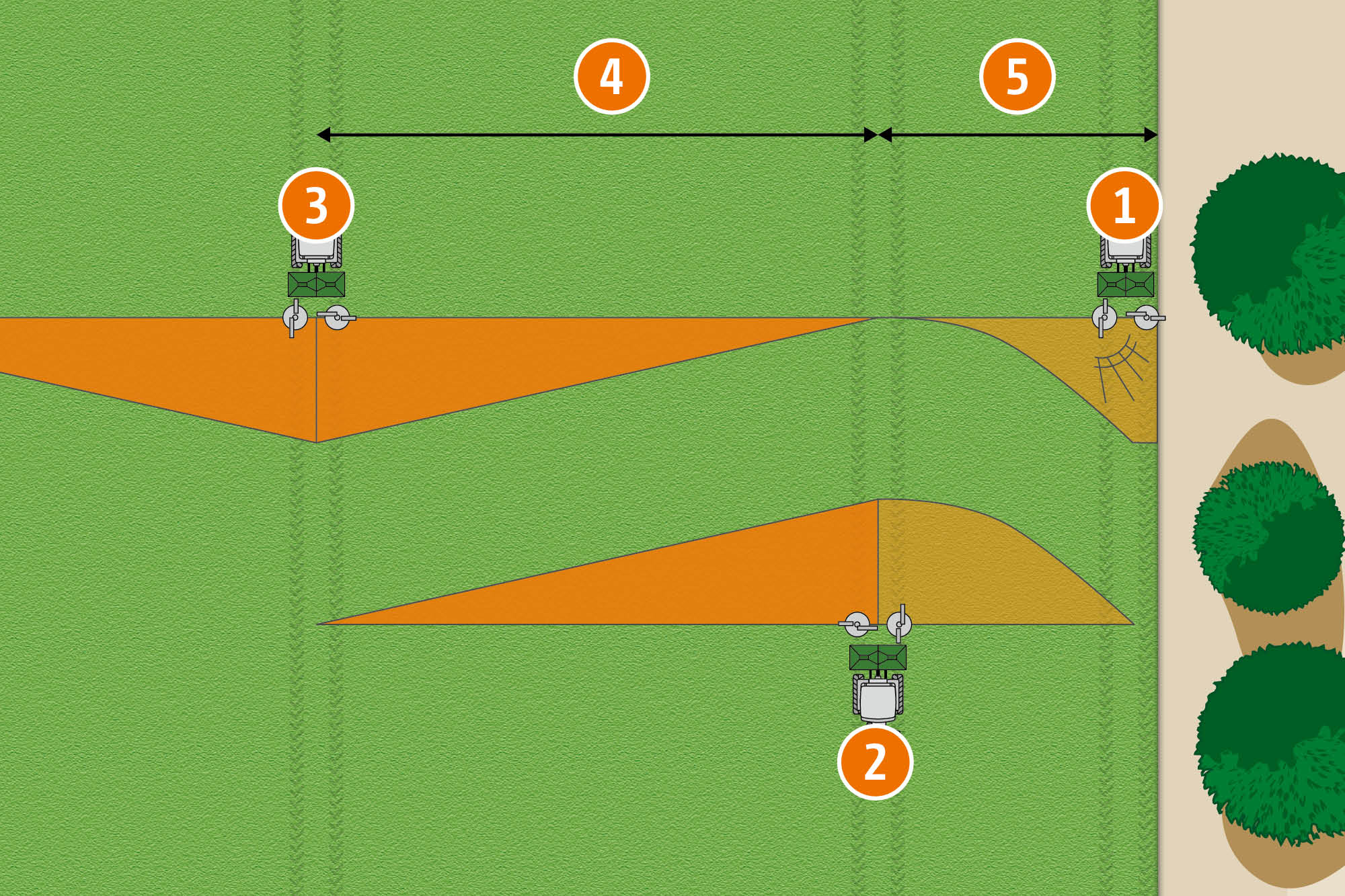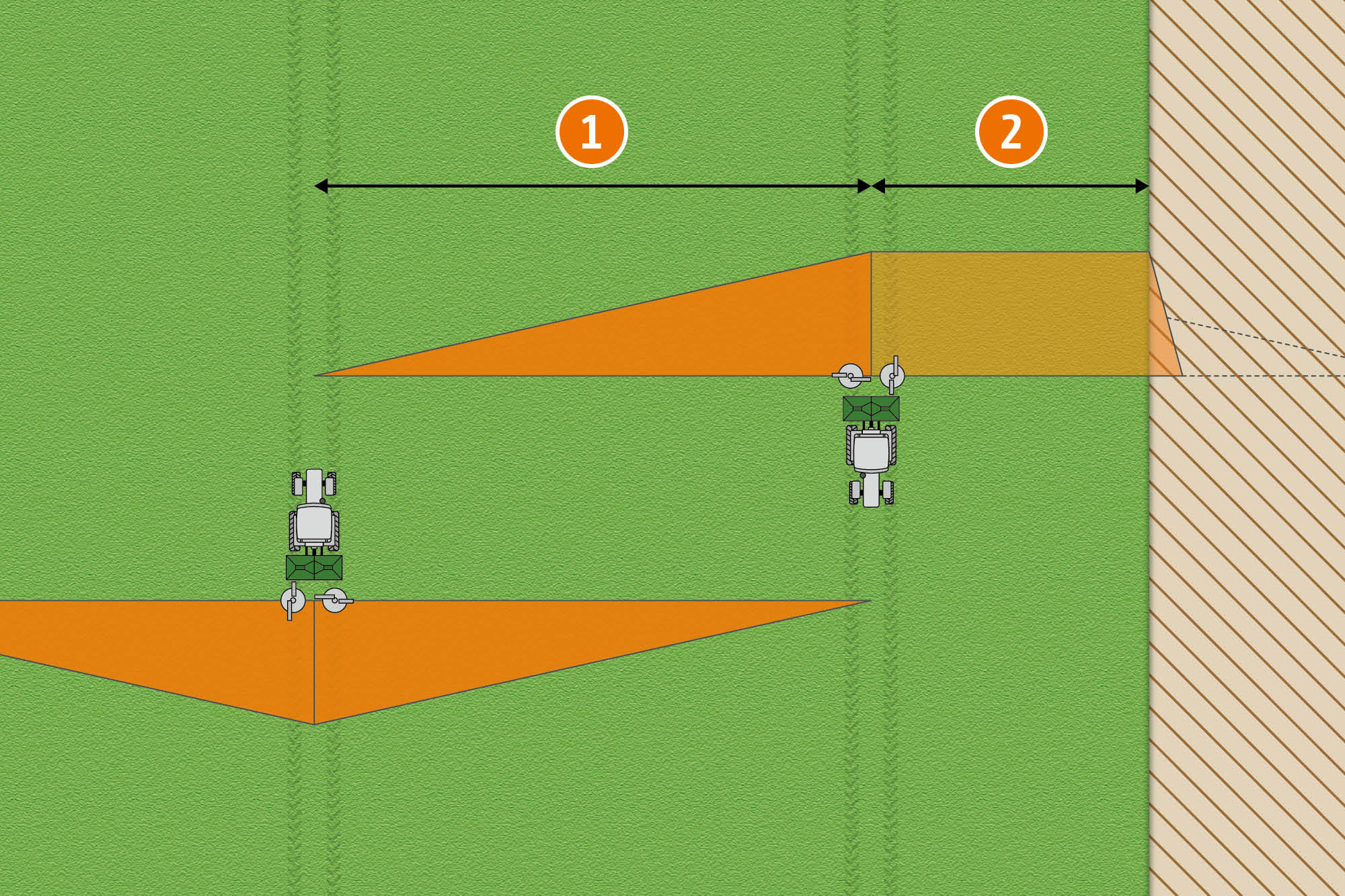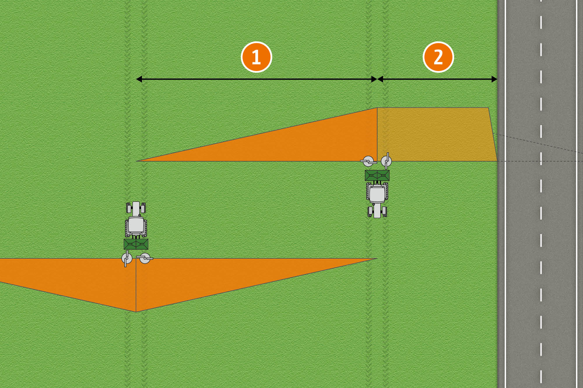 - Műtrágya kiszórása a BorderTS ernyővel a tábla határától a növényállományba, az előírt mennyiség 50%-ra történő automatikus csökkentésével. A táblahatár oldalán lévő adagolónyílás zárva van.