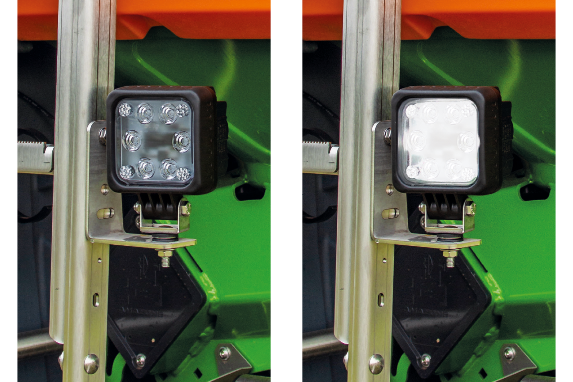 Ennél a megoldásnál LED-es munkafényszórók találhatók a tartályban, a szórótárcsák felett és a műtrágyaszóró két oldalán. Ez biztosítja, hogy a felhasználó még sötétben is ellenőrizheti a tartály töltöttségi szintjét, és elegendő fény áll a rendelkezésére a szórótárcsák cseréjéhez és a szórólapátok teleszkópjainak beállításához.