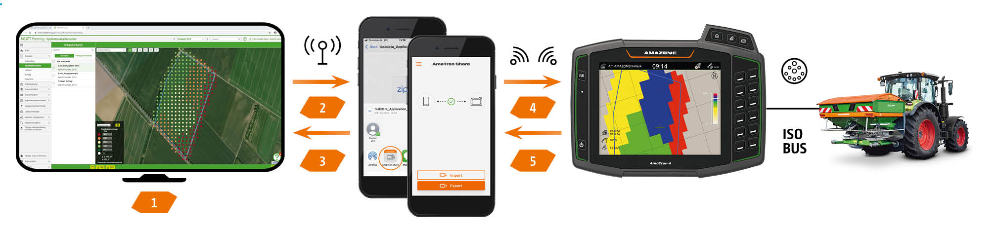 Minden adat kényelmesen importálható és exportálható online az AmaTron Share alkalmazáson keresztül, amely WLAN-on keresztül csatlakozik az AmaTron 4 készülékhez. Az alkalmazással például az irodából alkalmazási térképek küldhetők az AmaTron 4 készülékre, majd ott feldolgozható. A munkaadatokat felhőben, e-mailen vagy üzenetküldő szolgáltatásokon, például WhatsApp-on keresztül felhőalapú PDF-dokumentációként el lehet küldeni az ügyfeleknek vagy az irodába. Ez az adatkezelés egy igazán kényelmes formája.