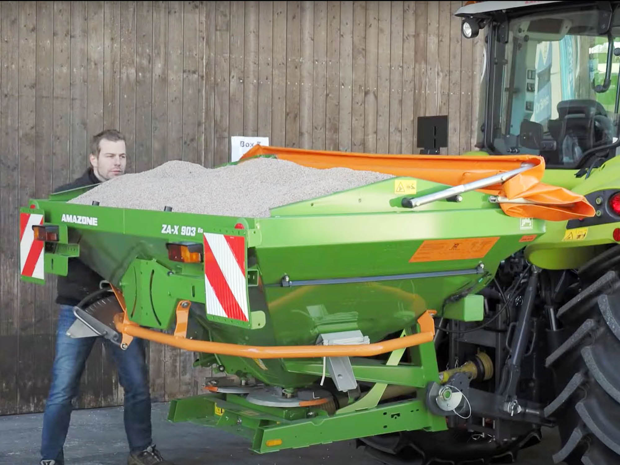 A takaróponyva feltöltés előtt egyszerűen felhajtható. A műtrágyaszóró így könnyedén feltölthető. Feltöltés után a felhajtható takaróponyva visszazárható. Így a műtrágyaszórás rossz időjárási viszonyok esetén is folytatható.