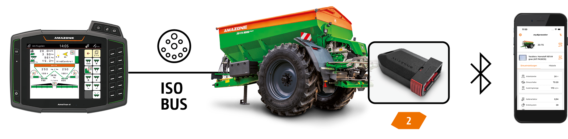 Egy Bluetooth-adapterrel a beállítási értékeket át lehet vinni a mySpreader alkalmazásból az AMAZONE műtrágyaszórókra. Ez időt takarít meg, elkerülhetők a beállítási hibák és sokkal kényelmesebb.