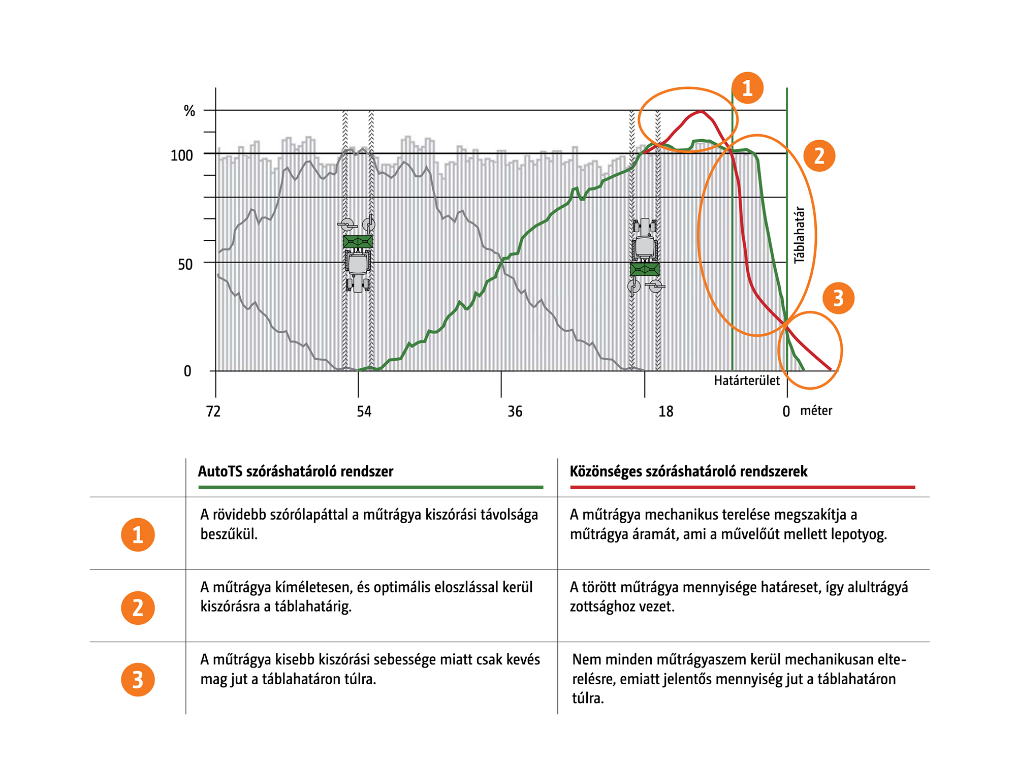 Az AutoTS szóráshatároló rendszer lehetővé teszi a felhasználónak, hogy rendkívül megbízható módon meredeken eső határszórási képet hozzon létre, és így a táblahatárhoz egészen közel is optimális fejlődési feltételeket biztosítson a növények számára. Az eddigi határszórási eljárásokkal szemben ezzel egyértelműen nagyobb terméshozam érhető el.