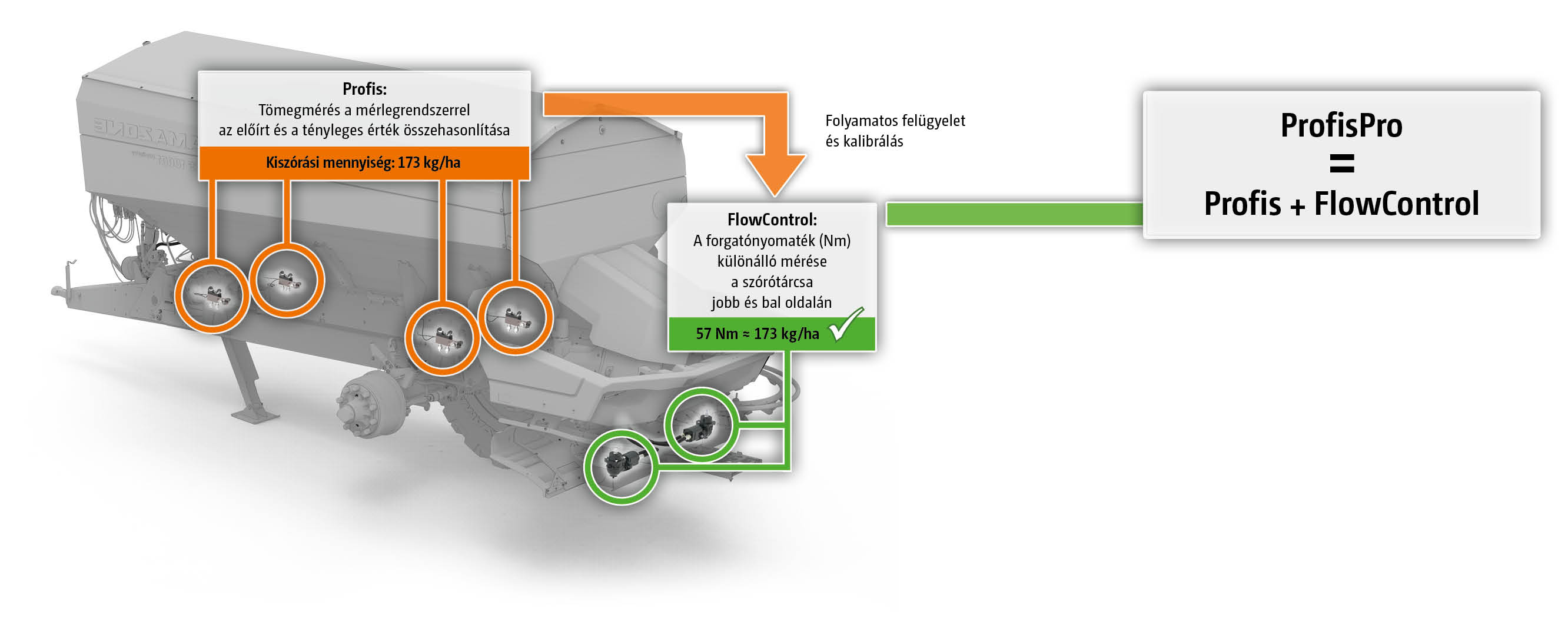 A Profis mérlegrendszer és a FlowControl kombinációjával a műtrágyaszóró a forgatónyomatékok alapján a szórás teljes ideje alatt szabályozza az elméleti kiszórási mennyiséget. Ennek keretében a Profis mérlegrendszer 25 kg-onként ellenőrzi a ténylegesen kiszórt mennyiséget, a FlowControl pedig ez alapján rendszeresen újrakalibrálja magát. Mindez megállás nélkül történik. A ProfisPro intelligens mérlegrendszerrel így a munkavégzés első másodpercétől kezdve optimálisan alakul a kiszórási mennyiség. A gépkezelő emellett bármikor áttekintheti a tartályban tényleges található maradék mennyiséget, valamint a megművelhető területet.
