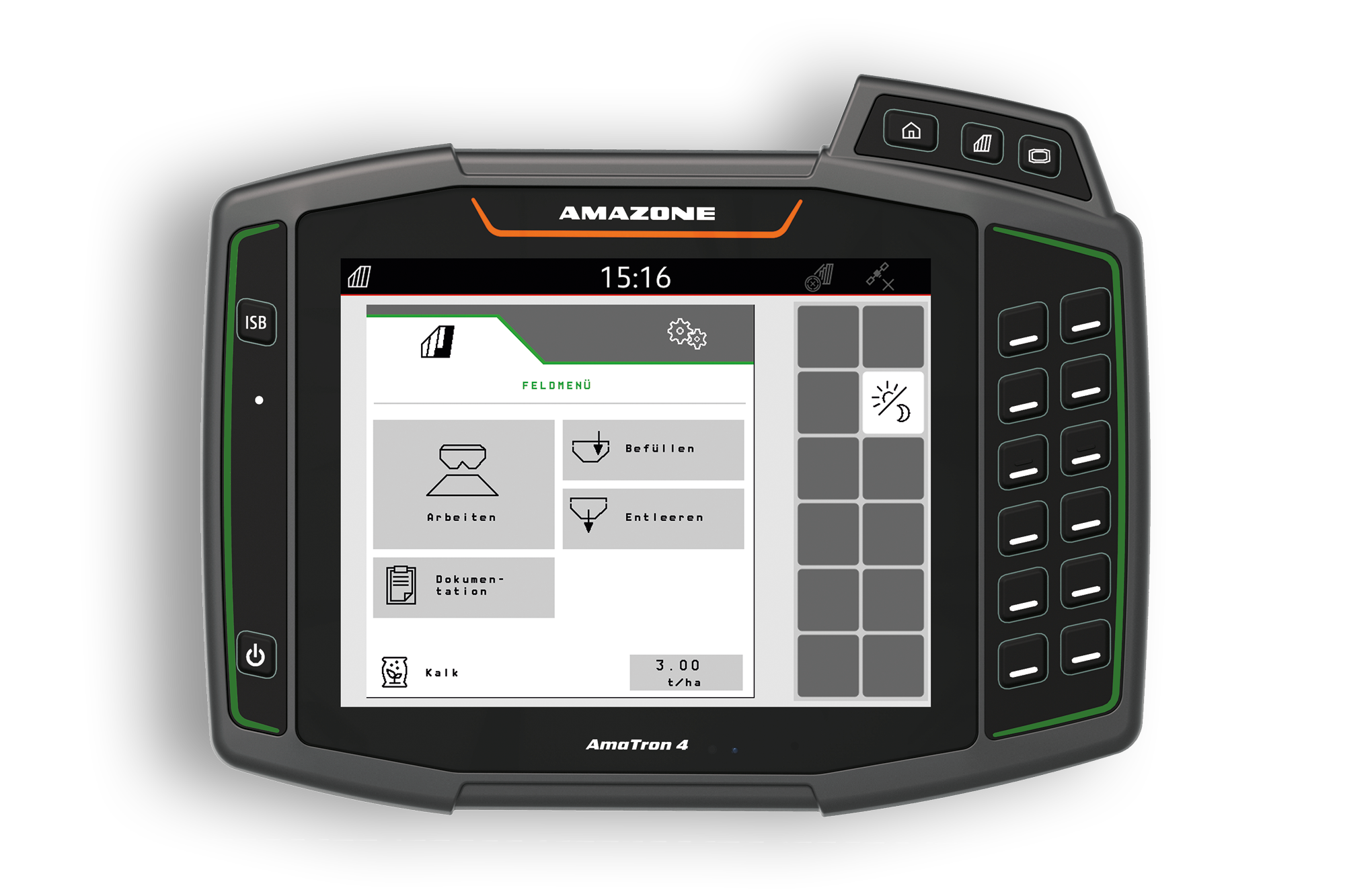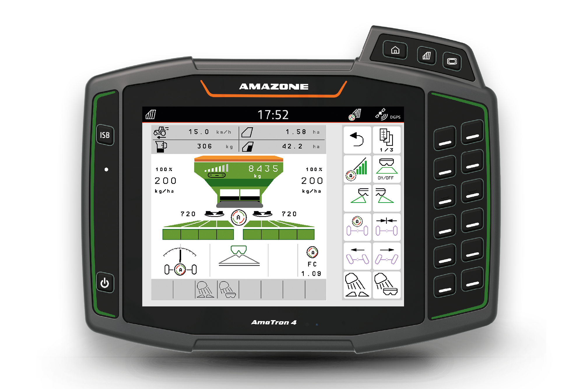 Az AMAZONE saját fejlesztésű AmaTron 4 ISOBUS kezelőterminál lehetővé teszi bármely ISOBUS-képes mezőgazdasági gép kényelmes, érintéses kezelését. Az AmaTron 4 lehetővé teszi az összes ISOBUS funkciót - még nagyobb kényelemmel, felhasználóbarátság kezelhetőséggel és áttekinthetőséggel. Sőt, mi több: Az AMAZONE mezőgazdasági gépeivel kombinálva még nagyobb teljesítményre képes és minden funkciót biztosít a precíziós gazdálkodáshoz.