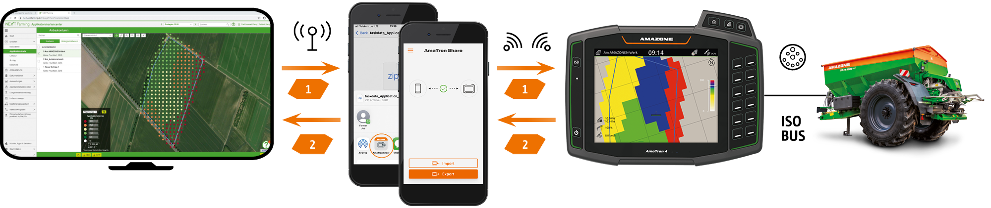 Minden adat kényelmesen importálható és exportálható online az AmaTron Share alkalmazáson keresztül, amely WLAN-on keresztül csatlakozik az AmaTron 4 készülékhez. Az alkalmazással például az irodából alkalmazási térképek küldhetők az AmaTron 4 készülékre, majd ott feldolgozható. A munkaadatokat felhőben, e-mailen vagy üzenetküldő szolgáltatásokon, például WhatsApp-on keresztül felhőalapú PDF-dokumentációként el lehet küldeni az ügyfeleknek vagy az irodába. Ez az adatkezelés egy igazán kényelmes formája.