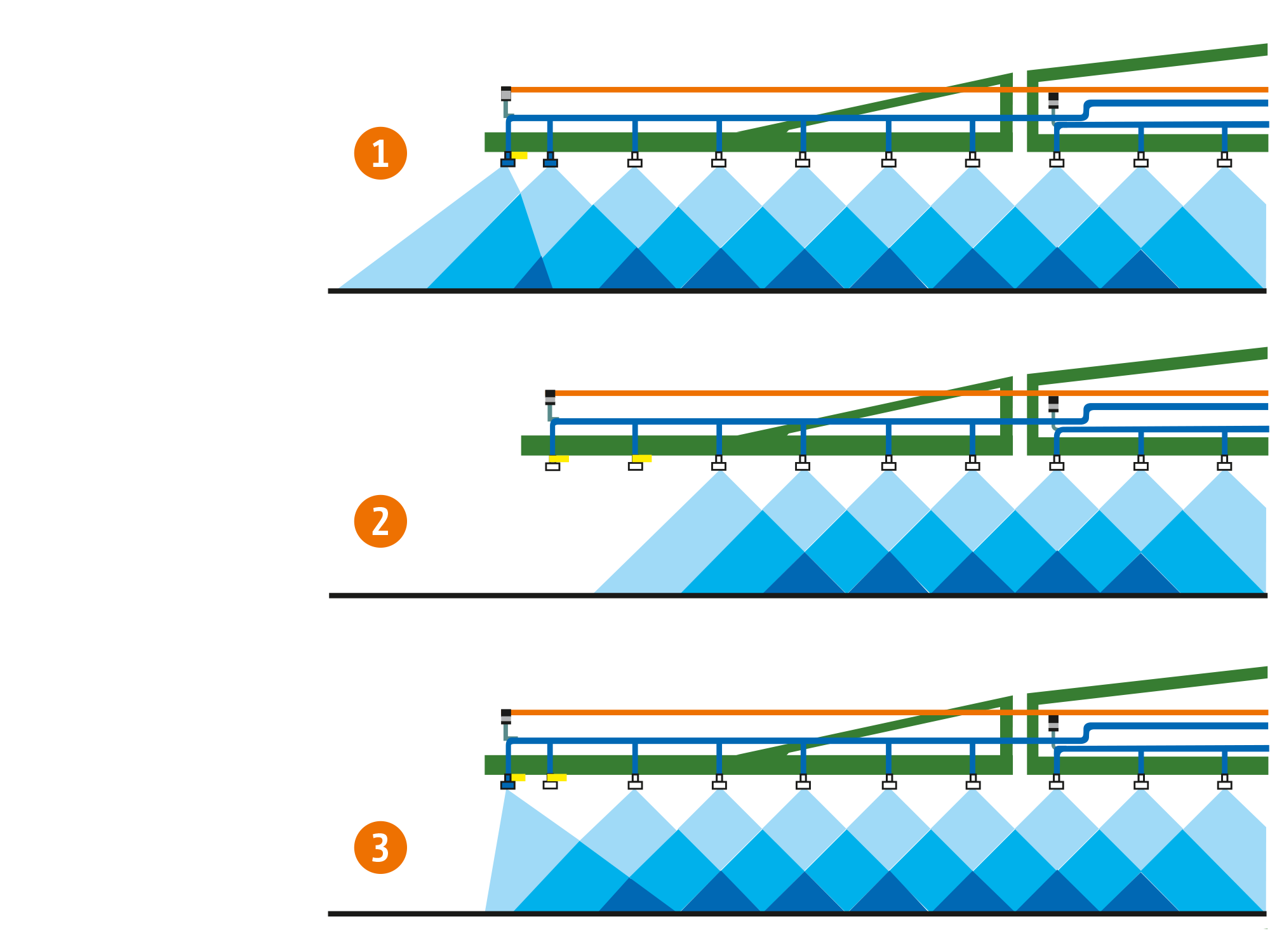 A rendes munkaszélesség növeléséhez aszimmetrikus fúvóka kapcsolható be. Ez mindenekelőtt akkor fontos, ha a művelőutak távolsága nem elég pontos.