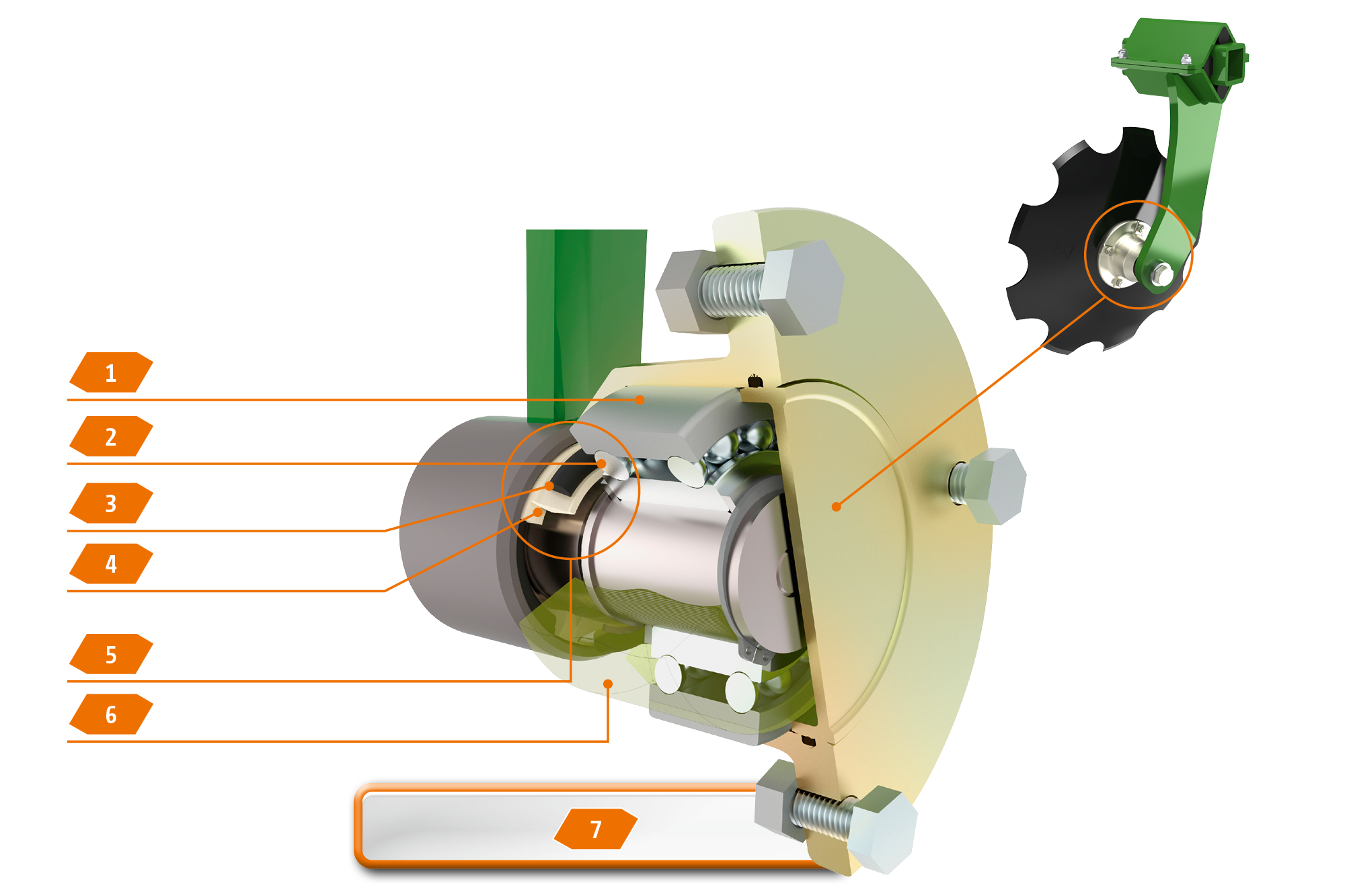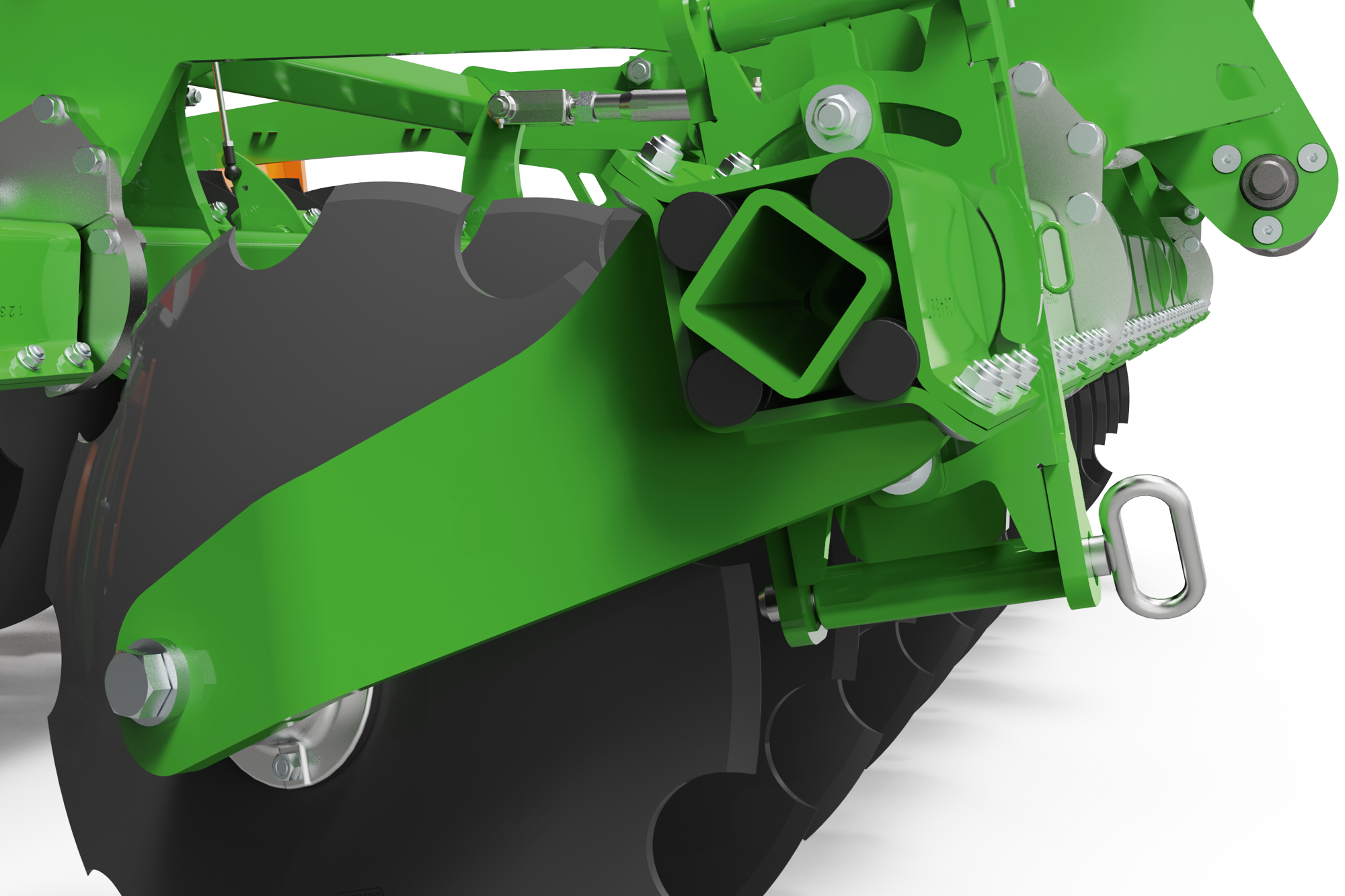 Az egyes tárcsák felfüggesztésében a rugalmas gumituskók nemcsak a talajfelület kontúrvonalához való optimális alkalmazkodásra, hanem az egyes tárcsák túlterhelés elleni biztosítására is szolgálnak. Az erős gumituskók nem igényelnek karbantartást, hosszú rugóúton emelkednek ki, ami nagy kövek esetén is biztonságot nyújt.