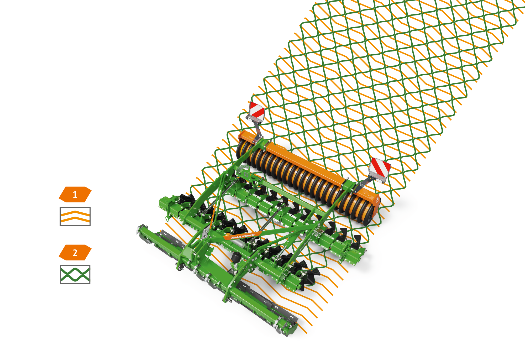 + tárcsák és CatrosXL tárcsák rendkívül meredeken állnak. Ez biztosítja a talaj-szalma keverék folyamatos átadását az első tárcsasorról a második tárcsasorra, és első osztályú talaj és növénymaradvány átkeverést eredményez. A sekély elrendezésű tárcsákkal összehasonlítva a meredek elrendezésű tárcsák kidobási szöge egyértelműen kisebb. Így az átáramló talaj-szalma keveréket már az elmunkáló henger előtt újból megfelelően a talaj felszínére helyezik.