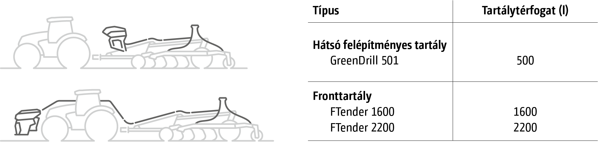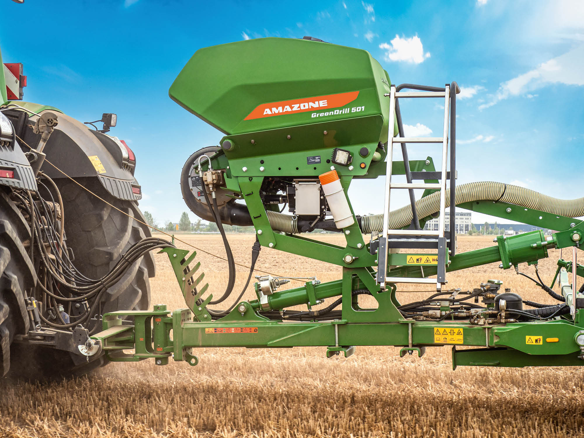 Az AMAZONE a GreenDrill 501 hátsó felépítményes tartályt kínálja, amelynek tartálya 500 literes, és lépcsőkön keresztül biztonságosan megközelíthető, így a köztes termények közvetlenül vagy a talajművelés során is kijuttathatók.