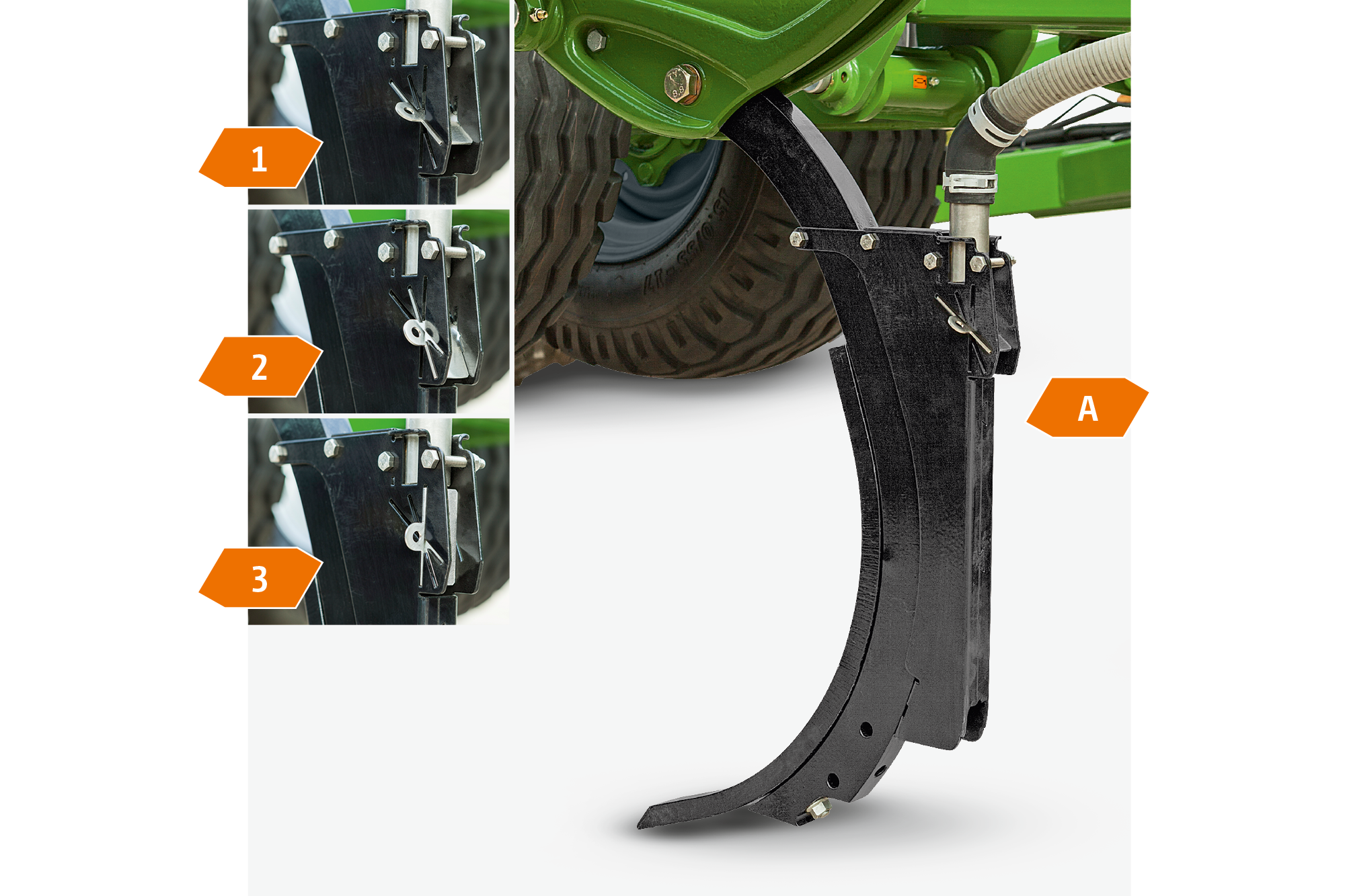 Műtrágya-behelyező fogak 40 mm széles C-Mix kapával a vetőmagvak vagy a műtrágya közvetlenül a lazított talajba történő kijuttatásához, 1) 100% kivezetési beállítással az „A” kivezető nyílás felett, 2) 50% kivezetési beállítással az „A” kivezető nyílás felett és 50% kivezetési beállítással a „B” kivezető nyílás alatt, valamint 3) 100% a „B” kivezető nyílás alatt.