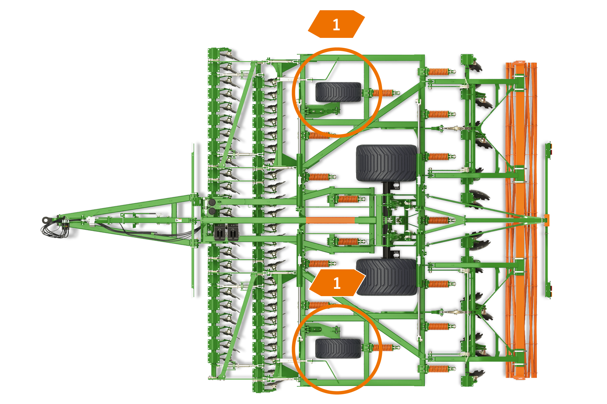 A gép még nagyobb munkaszélesség esetén is egyenletesen fut, és állandó mélységgel dolgozik; 6 m-es vagy nagyobb munkaszélesség esetén további belső támkerekek vannak felszerelve. Ahhoz, hogy ezen kerekek nyomai azonnal fel legyenek lazítva, minden ilyen kerék mögött található egy-egy nyomlazító.