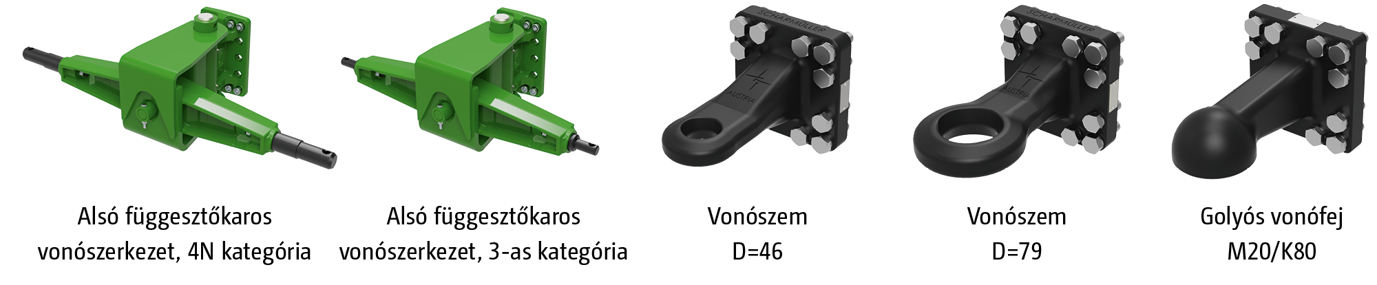Ehhez mindössze a rögzítőcsapokat kell kicserélni. Így minden traktorhoz kiválasztható a megfelelő vonószerkezet, legyen szó 3, 4N, K700 alsó függesztőkaros vonószerkezetről, különböző vonószemekről vagy K80 golyós vonófejről.