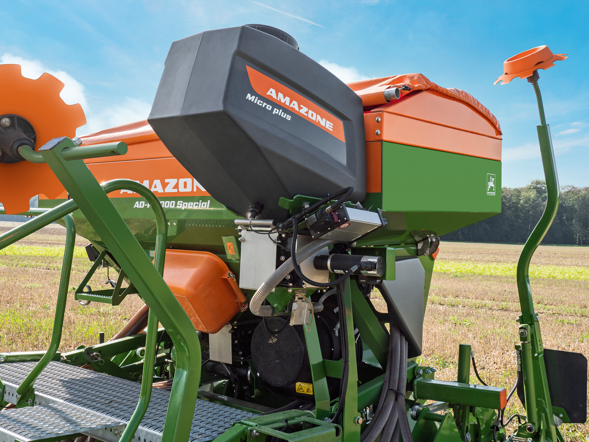 1. Elektromos adagolóhajtás: Az AD-P gép alapfelszereltségéhez tartozó, míg az Avant géphez opcionálisan kapható elektromos adagolóhajtás szabályozásáról az AmaTron 3, illetve egy tetszőleges ISOBUS terminál vagy az AmaDrill+ gondoskodik. A kalibrálás az elektromos hajtás segítségével kényelmes és teljesen automatikus. Az elektromos hajtás olyan további funkciókat kínál, mint pl. a vetőmag előadagolása a terület elején továbbá a vetőmagmennyiség növelése vagy csökkentése a munka során. Az AD-P esetében a sebesség megállapításához különböző jelforrások állnak rendelkezésre. A radarérzékelő, az impulzuskerék vagy a GPS-jel mellett a traktor sebességjelét is fel lehet használni.