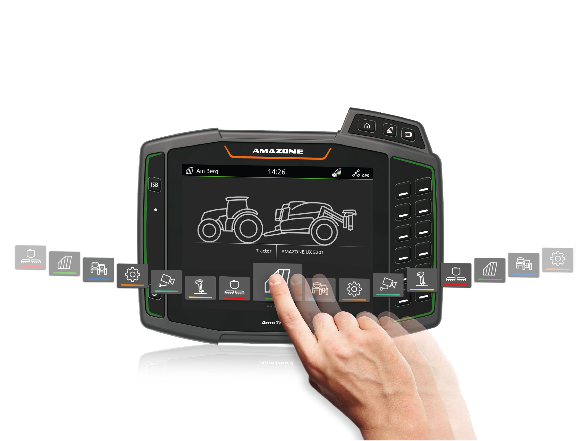 Egyszerű és kényelmes kezelés – olyan intuitív, akár a táblagépe: Miért ne lehetnének a terminálok is olyan intuitívak, mint a táblagépek vagy az okostelefonok? Az AMAZONE elgondolkozott ezen, és kifejlesztett a felhasználóbarát AmaTRON 4 terminált, mely érezhetően gördülékenyebb munkafolyamatot kínál, főleg a feladatkezelés területén. Az AmaTron 4 a 8 colos multitouch színes kijelzőjével a legmagasabb igényeket is teljesíti, és maximálisan felhasználóbarát kezelést kínál Önnek. Akár ujjunkkal vezérlünk, akár az alkalmazástárcsával, gyorsan eljutunk az egyik alkalmazásból a másikba, ill. az érthetően és egyszerűen strukturált kezelőmenübe. Praktikus MiniView, szabadon konfigurálható állapotsor, valamint egy integrált fénysor teszi az AmaTron 4-et különösen áttekinthetővé és kényelmessé.