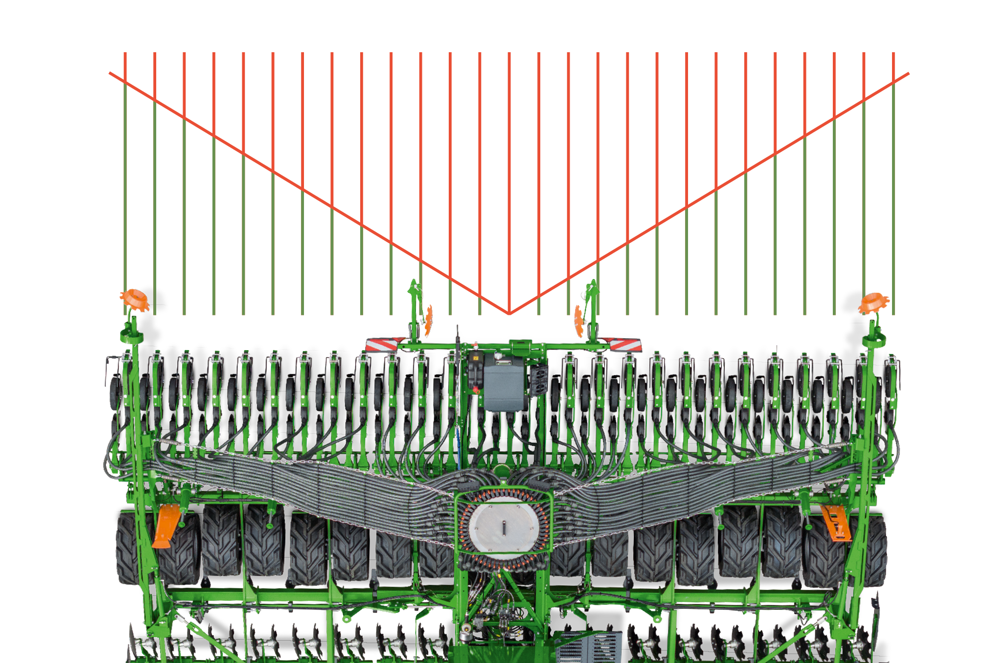 A jó keresztirányú eloszlásról az új elosztófej gondoskodik. Soronkénti vetőmag-/műtrágya-adagoláslekapcsolással rendkívüli fenntarthatóságot biztosít a vetőmag- és műtrágya megtakarítása által. A művelőút létrehozásához az elosztófej felhasználóbarát módon az ISOBUS terminálon keresztül hozzáigazítható minden szimmetrikus és aszimmetrikus művelőútrendszerhez, valamint minden nyomtávhoz és nyomszélességhez. Mechanikus beavatkozás nem szükséges. Mivel a külső vetőcsoroszlyák magvezető csövei hosszabbak, mint a belsőké, a soronkénti vetőmag-/műtrágya-adagolás időben késleltetett nyitása és zárása csökkenti a további átfedések mértékét a fordulóban. Kezdéskor a vetőgép elsőként kívülről befelé haladva juttatja ki a vetőmagot, befejezéskor pedig belülről kifelé.