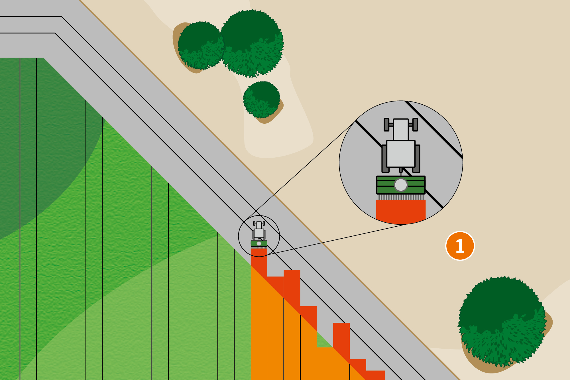 Ha a kezelendő terminál rendelkezik olyan Section Control funkcióval, mint pl. az AMAZONE GPS-Switch szakaszolás, a szakasz váltása automatikusan, a GPS pozíciótól függően történhet. Ha felveszünk egy területet, automata üzemmódban a vezető teljes mértékben a jármű kezelésére koncentrálhat, mivel ékekben és fordulókban a szakaszváltás automatikusan történik.