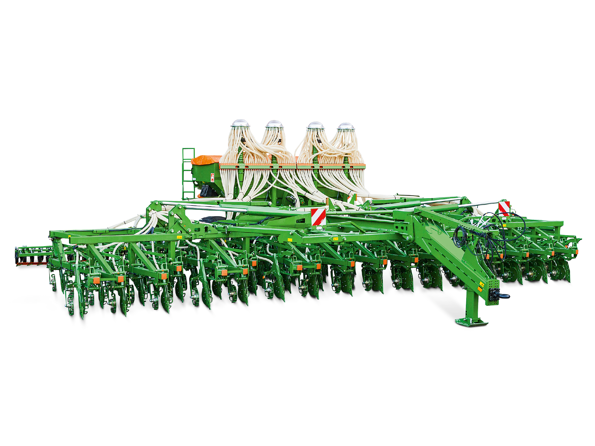 A kettéosztott feltöltőcsiga a gép hátoldalára van felszerelve. A munkához és szállításhoz az alsó csigaelem a betöltő-tölcsérrel együtt gyorsan és egyszerűen felhajtható. A felső szállítócsiga-rendszeren lévő kihajtható csonknak köszönhetően a vetőmag optimálisan elosztható a tárolóedény teljes szélességében.