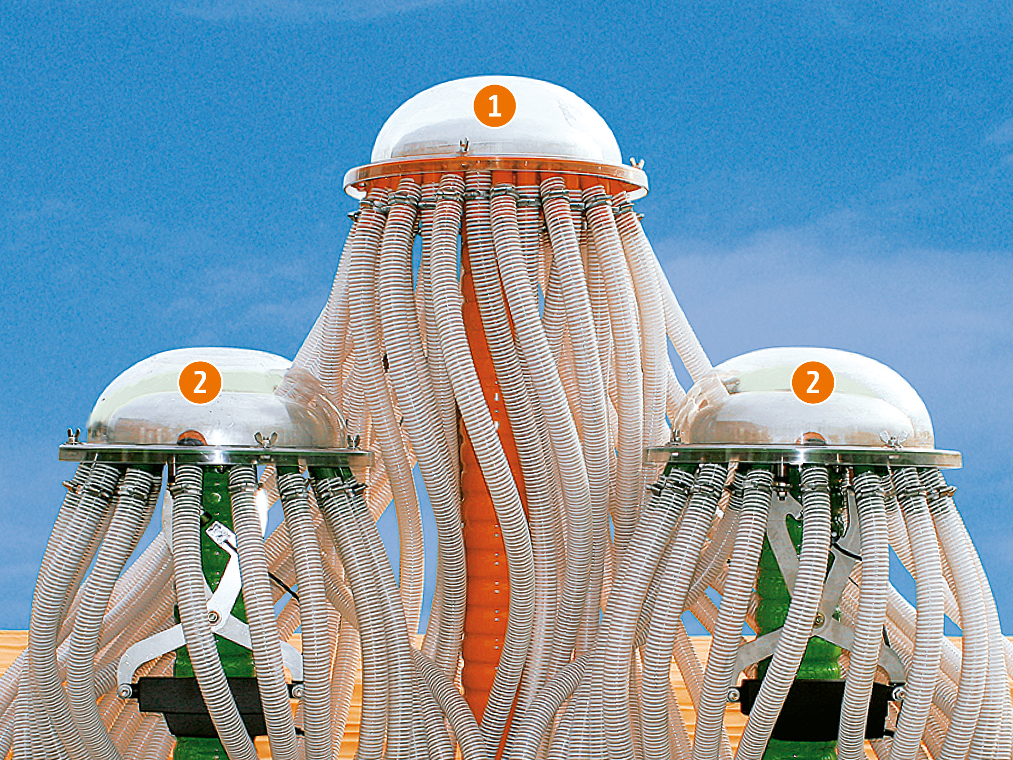 Az elosztófejek előnyei: A vetőmagtartályon kívül találhatók. A tartály szabadon hozzáférhető és a traktorvezető látóterében van. Az átlátszó elosztófejfedélben megfigyelhető a vetőmag és a műtrágya kiszórása. Opcionálisan vetőmagfelügyelettel egészíthető ki.